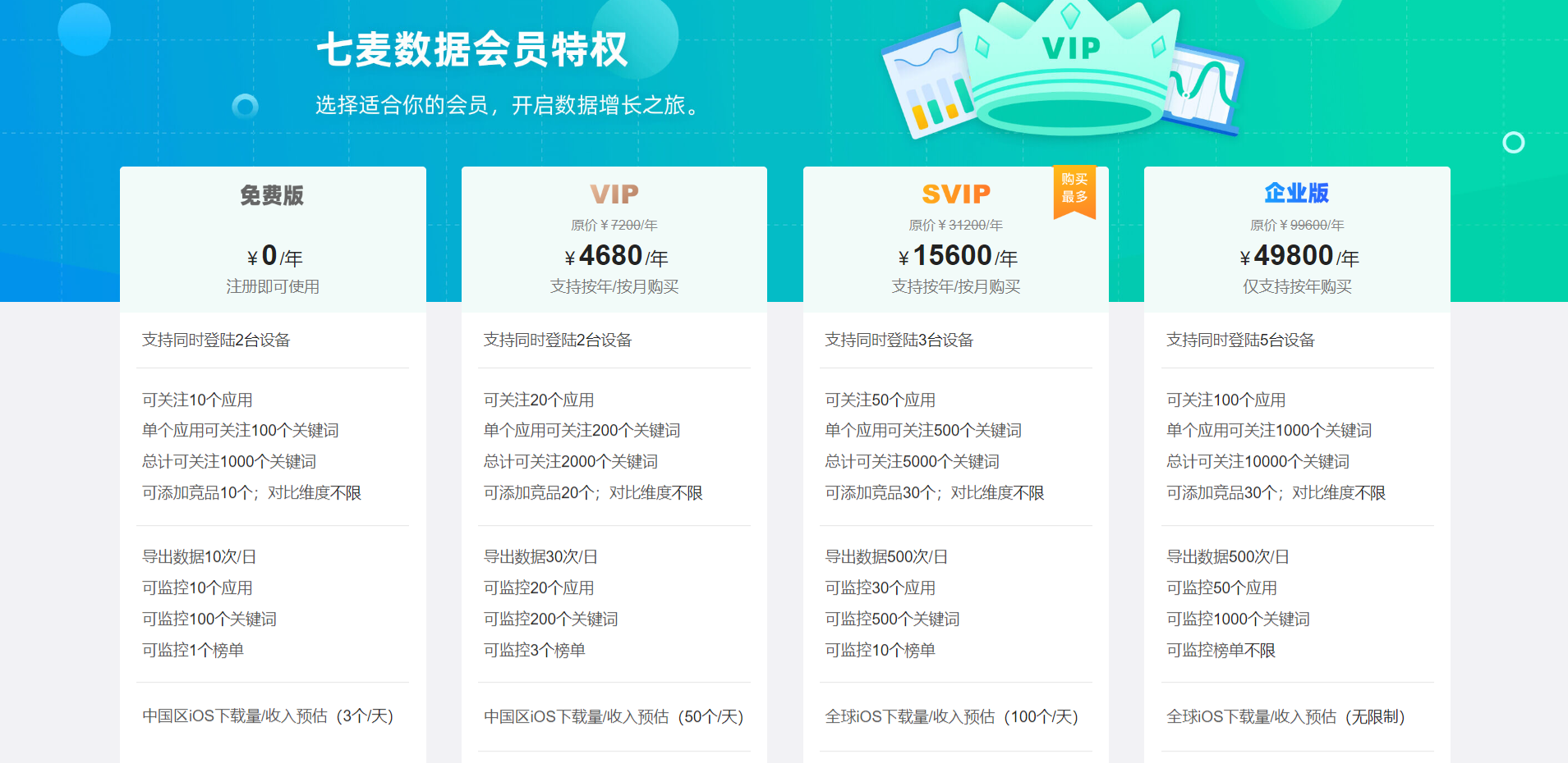 七麦数据提供了多档灵活的 vip 套餐,覆盖了各种用户需求,从免费使用到高级功能,满足了不同用户对移动应用数据分析和市场情报的需求,让用户能够根据自身需求选择适合的方案,并提供了多项附加权益,助力用户在移动互联网市场竞争中保持优势。
