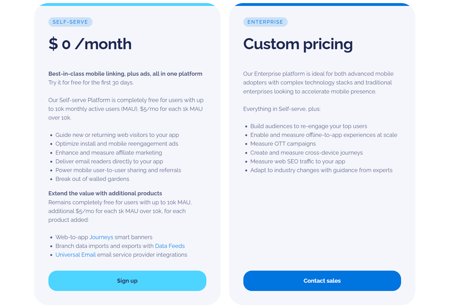 Branch 提供多种定价方案,让用户根据自身需求选择合适的方案。他们的 Self-Serve 方案针对月活跃用户(MAU)在 10,000 以下的用户免费使用,超过 10,000 的部分每增加 1,000 MAU 收取 5 美元 / 月的费用。这个方案包括了最先进的移动链接功能,同时还整合了广告服务,让用户在一个平台上进行管理。此外,用户可以在 30 天内免费试用。另外,若用户选择添加额外的产品,比如 Web 到 App 的智能跳转 Banner 或者数据导入导出功能等,同样适用这个收费标准。