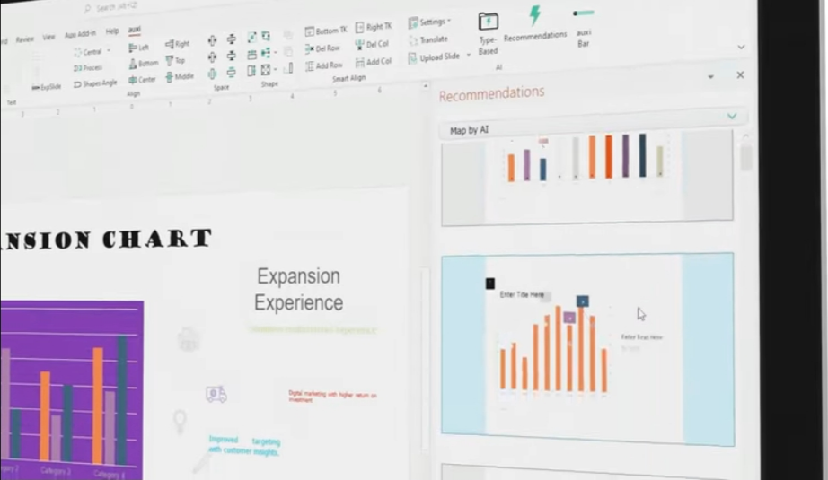 Auxi基于其机器学习模型,在幻灯片的右侧展示PPT设计建议,并自动将用户的内容填充到所选的设计布局中。