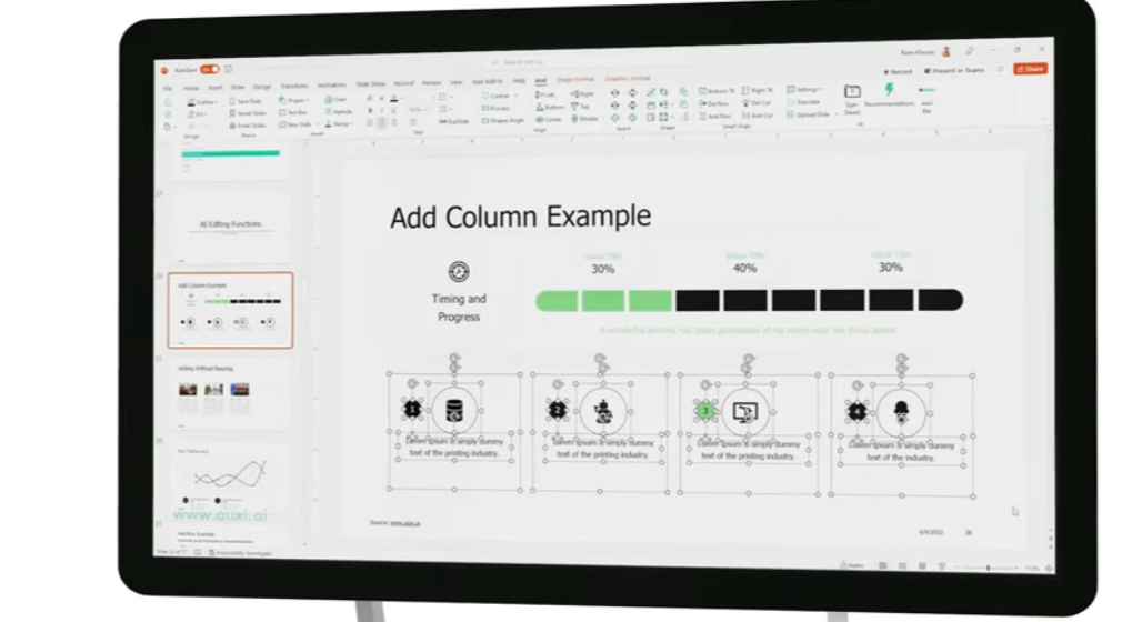 通过重新设计常用的PowerPoint功能,Auxi提供了使用者所需的各种操作指令,以提高PPT制作的速度和效率。