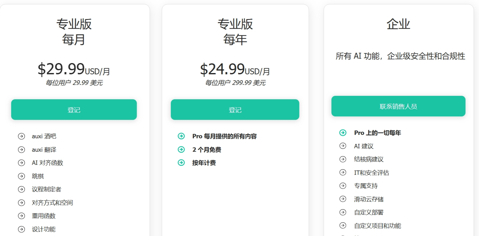 专业版(月付):包含基础功能,例如auxi翻译、议程制定、函数功能、设计功能等。