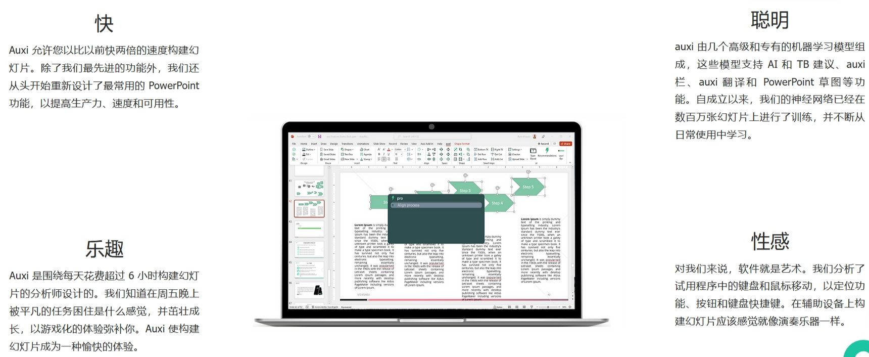 Auxi旨在提高PPT制作的速度和效率,它允许用户通过输入文字指令来修改和编辑PPT,同时提供了丰富的功能和特点。