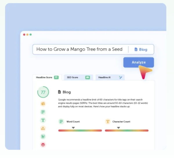 使用数据驱动的建议和想法来微调您的内容。通过做出改变来提高您的标题得分,从而超越竞争对手的头条新闻。确信每个标题都能带来最大的流量、参与度和 SEO 排名。