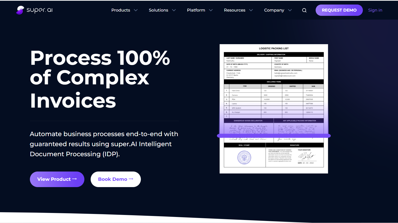 Super.AI智能文档处理(IDP)是一种端到端业务流程自动化解决方案,利用最新的大型语言模型(LLM)和改进的生成式人工智能驱动技术。