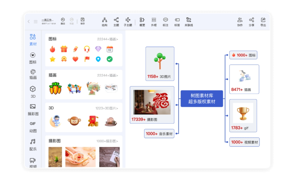 海量设计资源库:素材覆盖图标、插图、背景、摄影图、3D元素、GIF动图、音频、视频等多种类型,海量资源让思维导图更生动。