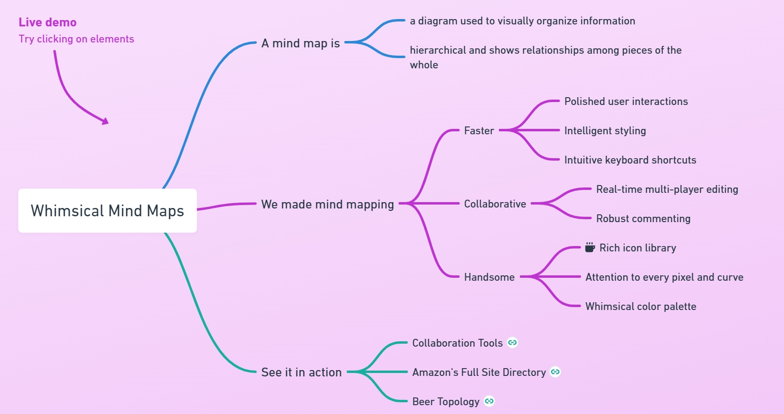 Whimsical支持脑图的绘制,用户可以整理思路、组织知识和进行头脑风暴。