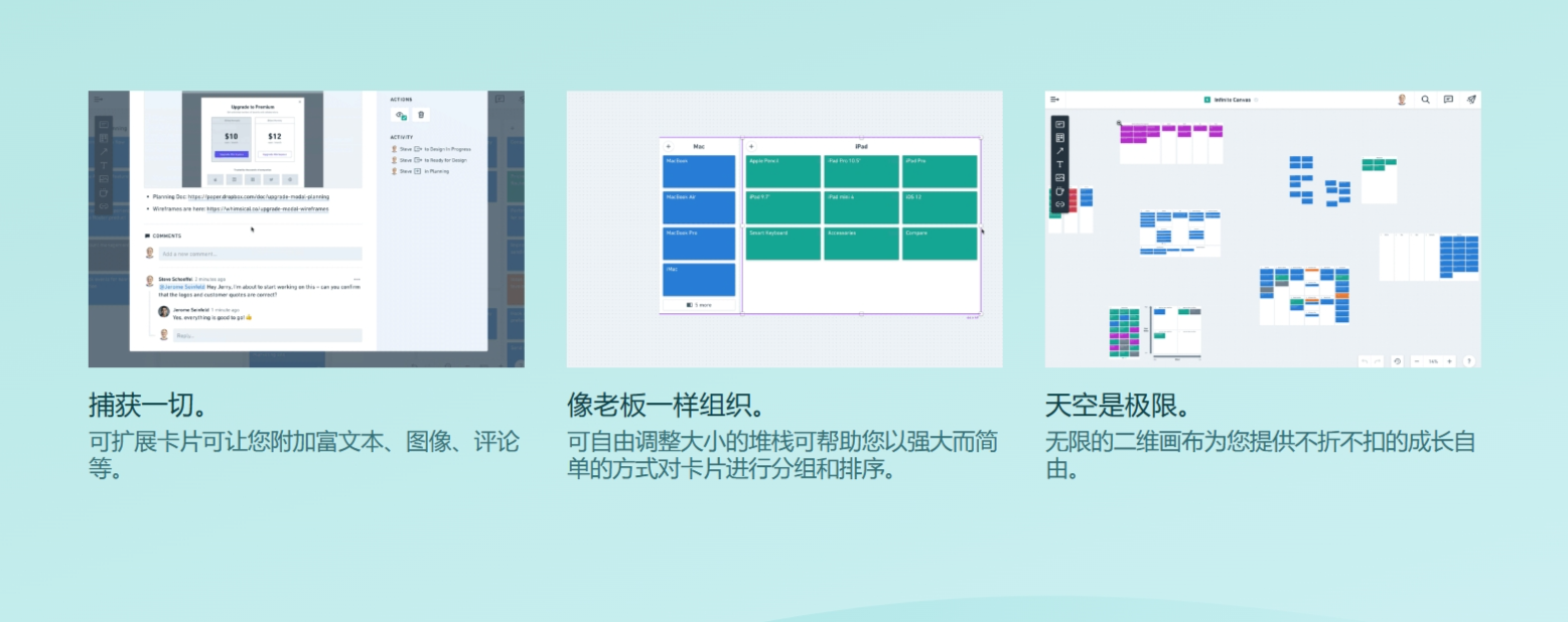 用户可以将卡片视作任务卡片,创建待办清单、分配任务给协作者,并按照进度进行排列和管理,类似于Trello的功能。