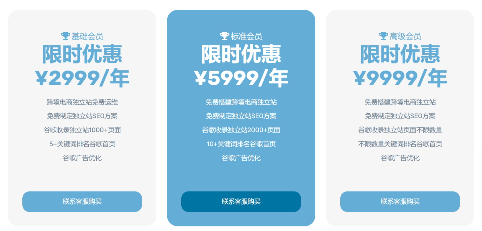 高级版:包含免费搭建跨境电商独立站、免费制定独立站SEO方案、谷歌收录独立站页面不限数量、不限数量关键词排名谷歌首页、谷歌广告优化等功能。