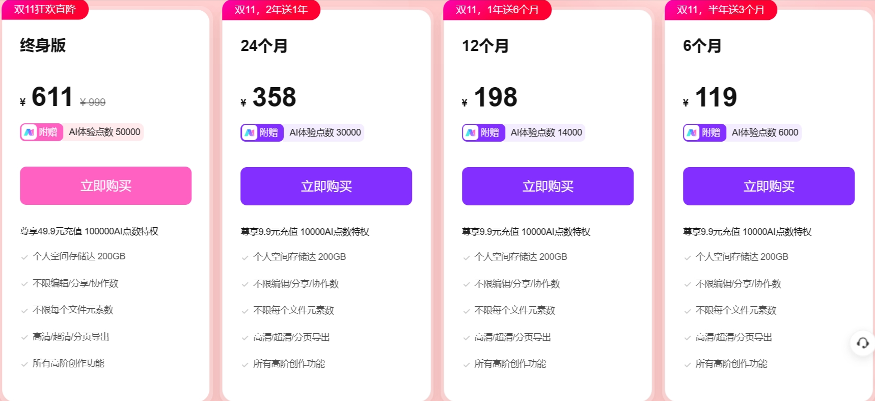 Boardmix购买时间越长,优惠越多。其功能相同,包含个人空间存储达200GB、不限编辑分享协作数、不限每个文件元素数、高清超清分导出、所有高阶创作功能等功能。