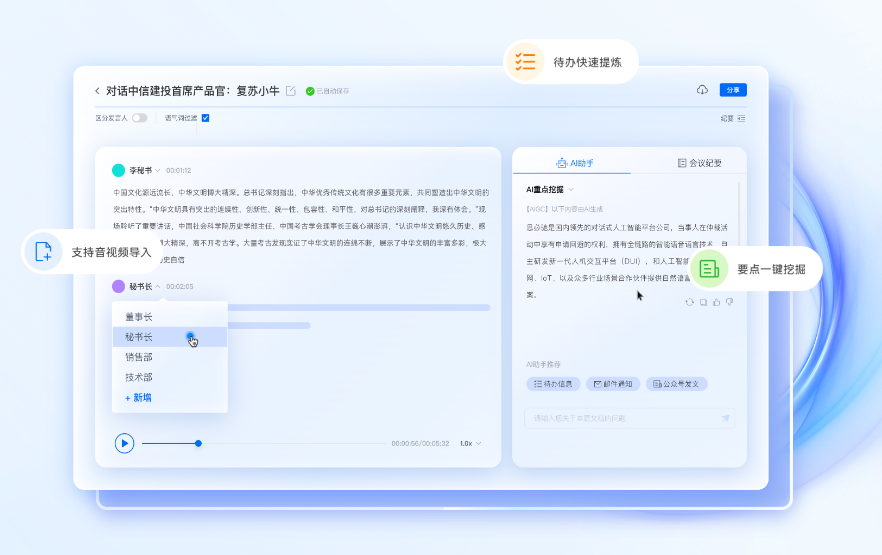 支持音视频导入转文本,工作待办信息快速提炼,文本要点内容一键挖掘。