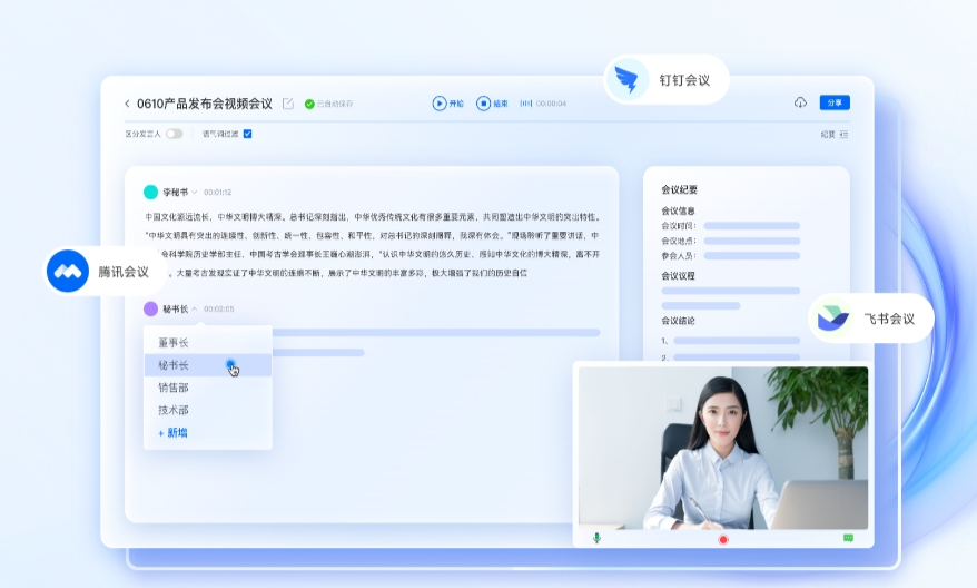 提供实时会议记录功能,兼容各类视频会议软件,支持远端、近端会议记录,会议内容不遗漏,AI实时会议议程,关键信息不遗漏,搭配思必驰智能麦克风,通话更清晰,记录更准确。