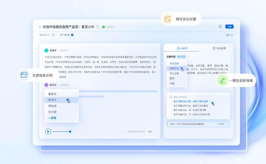 撰写会议纪要通知稿,省时省力更方便,一键生成新闻稿,行文流畅效率高,AI对话式文稿内容整理。