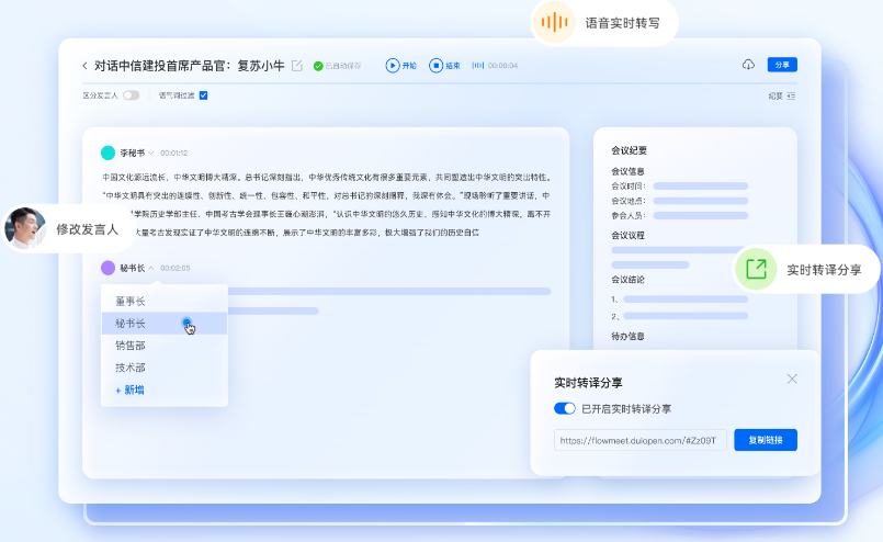提供实时录音转文字功能,边说边记边译,要点信息实时记录,文档整理更便捷,转写支持普通话、粤语、四川话、英文,搭配思必驰AI麦克风,录音更清晰,转写更准确。