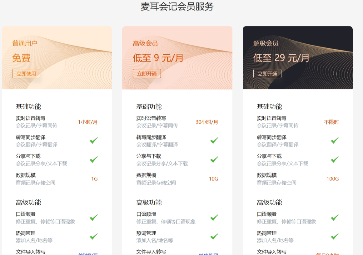 普通会员、高级会员、超级会员都包含基础功能,例如实时语音转写、同步翻译、分享下载等。