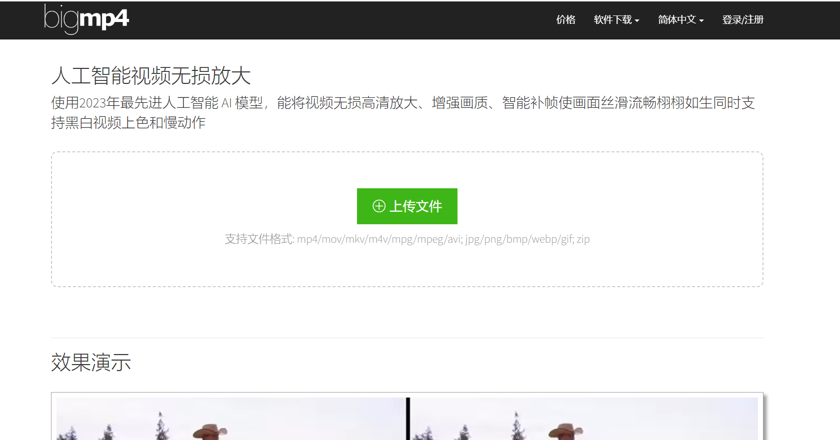 bigmp4 是利用人工智能技术,将视频无损高清放大的服务,同时增强画质、智能降噪补帧,使画面丝滑流畅。支持黑白视频上色、慢动作、图片批量处理等操作。