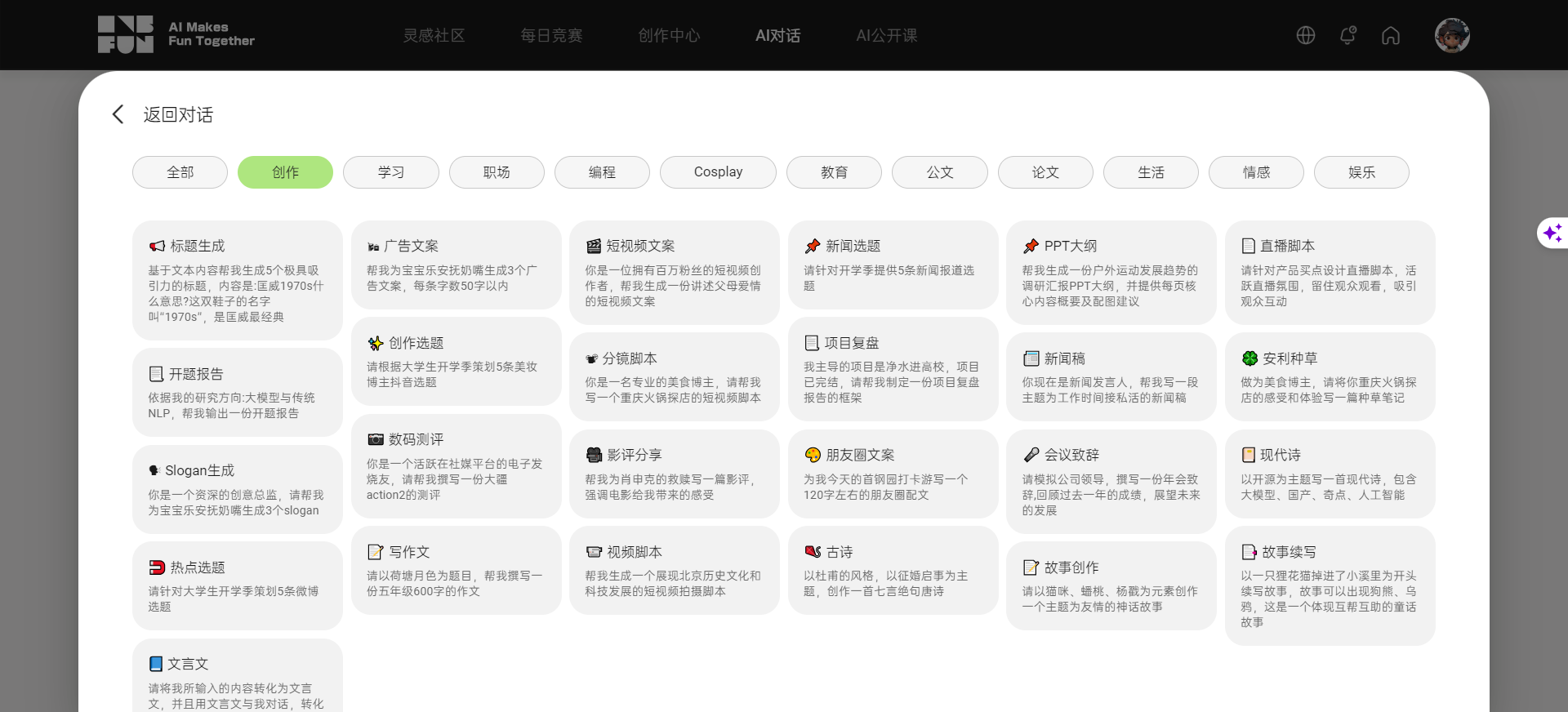 2. 创意工作者:平台提供的 AI 对话和创作中心的多种提示词分类可帮助广告人、设计师、创意写手等获取灵感和创作素材。