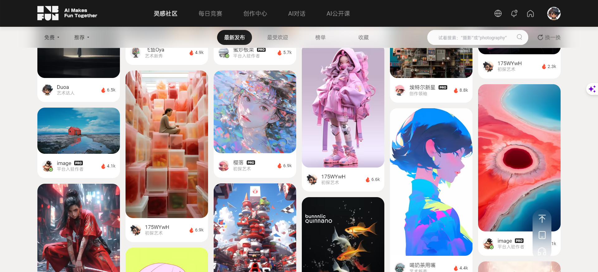 175FUN(原 一起玩 AI )是一个免费的 AI 作品分享平台和 AI 绘画提示词助手。您可以在平台上发现和探索各种精美的 AI 图片和插画,并使用内置的提示词词典生成英文提示词的可视化效果。它在抖音和微博展示活跃账号的 AI 创作,激励人们探索 AI 在艺术和创作中的创新可能性。