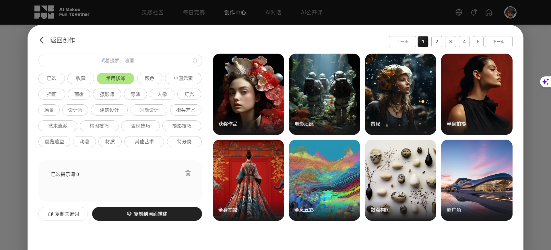 提供多种创作灵感提示词分类,如风格、大师、视角、色系、场景、人像、时尚、国风、影游、建筑、材质、灯光、布局等。用户可以点击特定分类,生成创作绘画的灵感,最后一键复制所选提示词。加入队列,生成提示词创作的绘画。