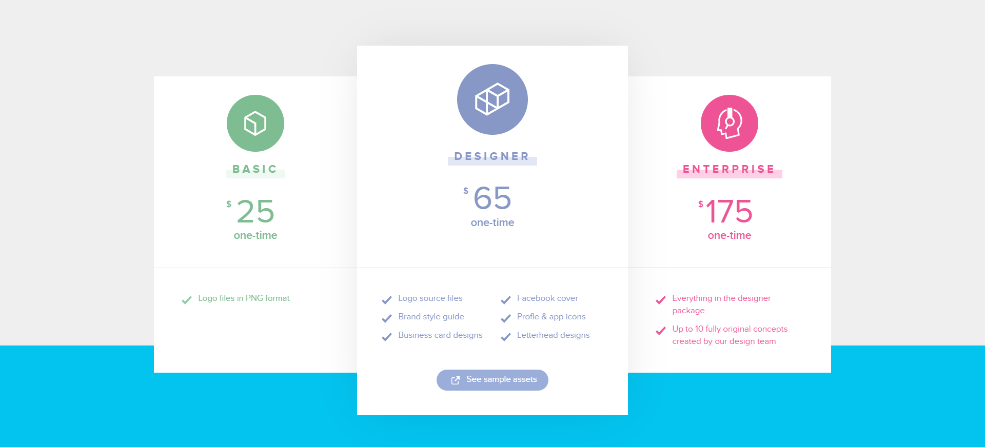 2. 设计版:65 美元的一次性价格,用于徽标源文件、品牌风格指南、名片设计、Facebook 封面图片、个人资料和应用程序图标以及信笺。