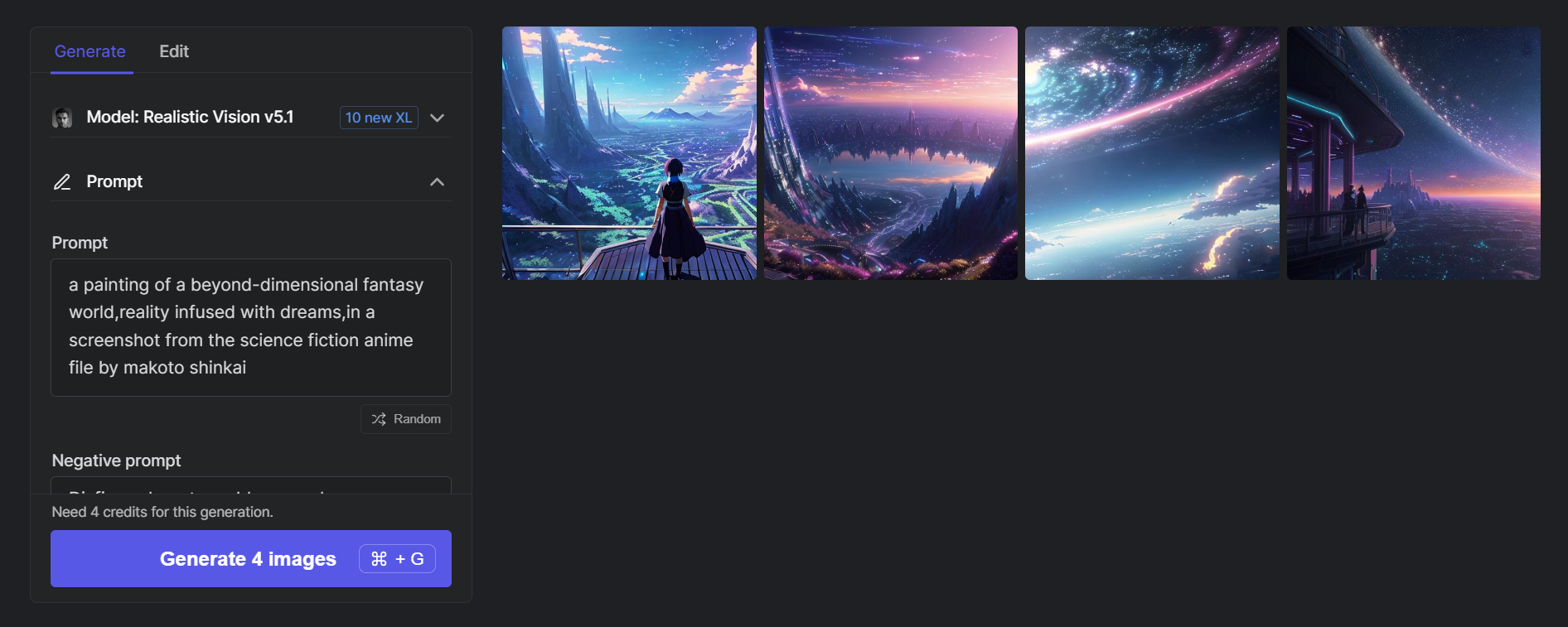 Getimg 中最引人注目的功能之一是文本到图像。该工具允许用户用文本创建各种类型的图像或艺术作品。用户可以自由发挥想象力,混合不同的艺术风格,或者描述想看到的内容,然后看着人工智能将想法变成现实。例如,可以输入“一幅超次元奇幻世界的画作,充满梦想的现实,来自新海诚科幻动画文件的截图”并得到如下内容: