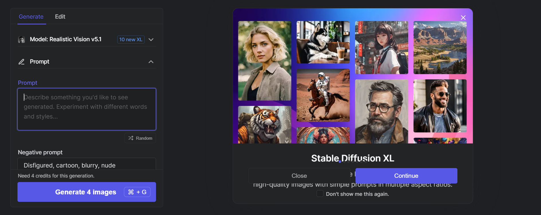 通过 Getimg,您可以将不同的艺术风格相互融合,描述您想要呈现的内容,AI 将会把您的想法变为现实。Getimg 提供了 60 多个经过社区培训的模型可供选择,让您可以将独特的风格应用于您的创作,甚至可以根据自己的艺术训练自定义模型。