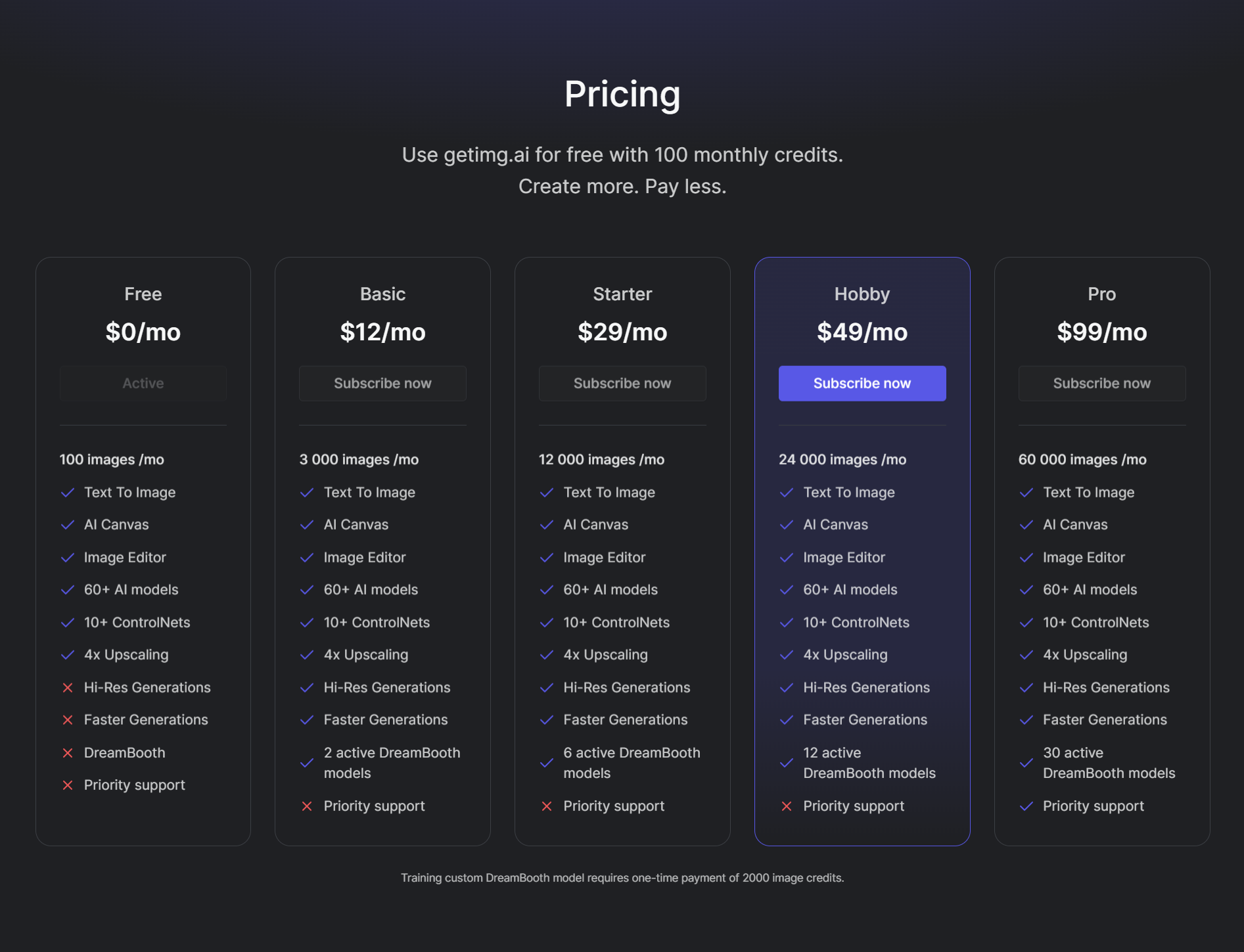 Getimg 提供了超值的定价优惠,让用户已您可以免费使用该工具并获得每月 100 个积分。利用这些积分,用户可以生成高质量的图像、升级现有图像或使用 DreamBooth 创建自定义模型。如果需要更多功能和操作,可以随时使用信用充值选项或升级到付费计划。