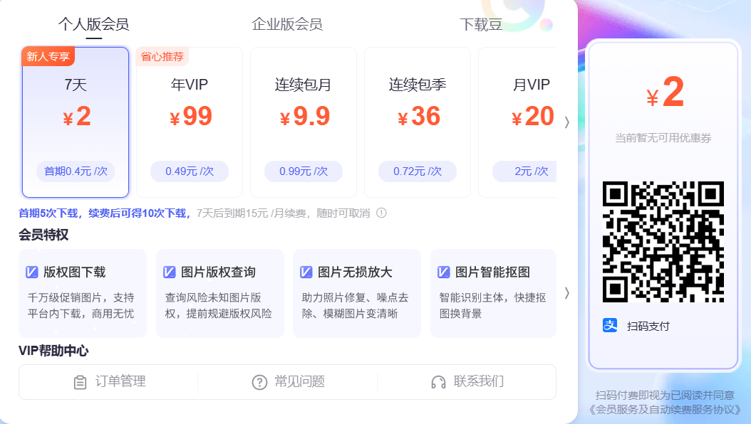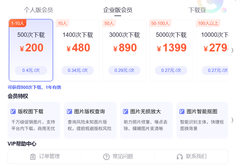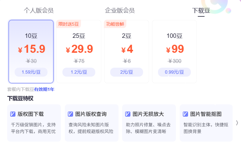 图查查设置了会员制套餐,分为个人版会员、企业版会员和下载豆