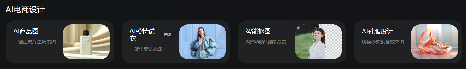AI商品图、AI鞋服设计、AI模特试衣、智能抠图。用户可以使用AI商品图功能,将产品照片智能优化,使其更加美观和吸引人。此外,还有AI鞋服设计和AI模特试衣功能,帮助用户在电商平台上展示产品和服装效果。智能抠图功能还能帮助用户快速去除背景,使产品图像更加干净和专业。
