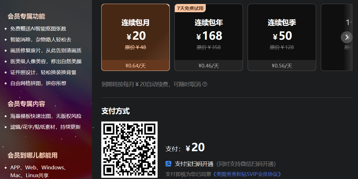 美图设计室设置了会员制套餐,按月收费,连续包年即可享受7天免费试用。