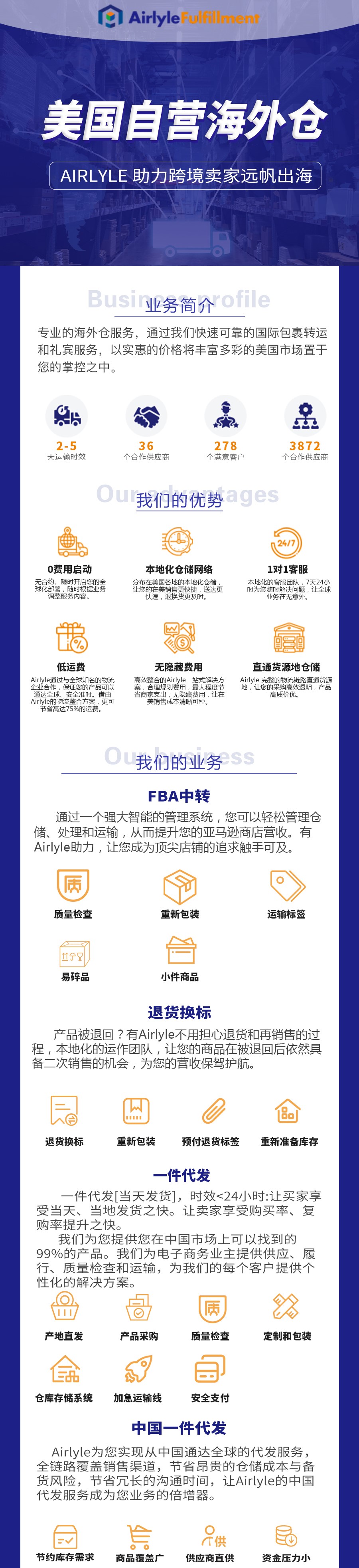 可接敏感货/普货一件代发、退货换标、FBA中转、头程空运海运.美国自营海外仓 ,Airlyle 助力跨境卖家远帆出海,Airlyle 助您搭建通达全球的物流解决方案,让您的业务轻松一点