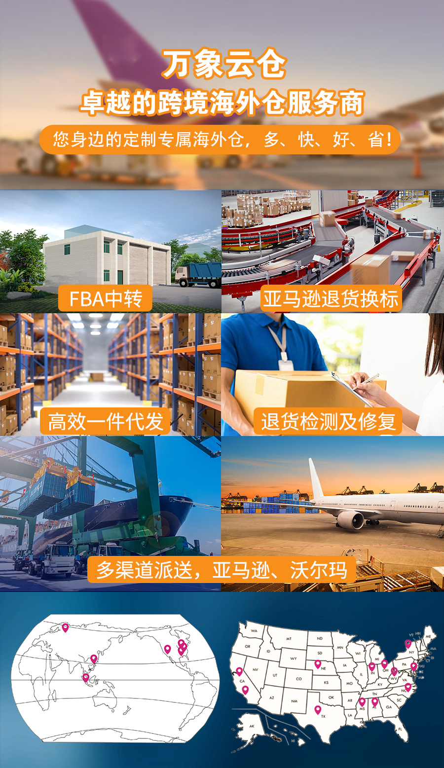 为跨境卖家提供一站式、安全、高效的海外仓储服务,提供FBA中转、一件代发、质检修复、移仓换标等服务,美国和欧洲多仓服务。
