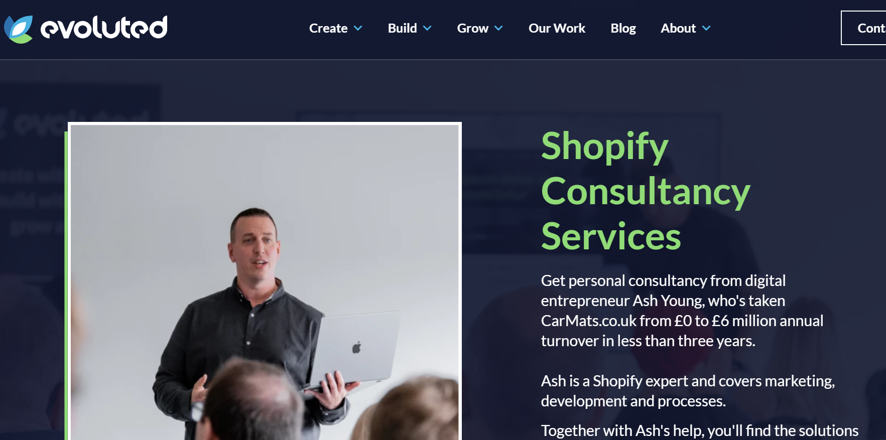 Evolated提供Shopify咨询服务,包括与数字企业家Ash Young的个人咨询合作。Ash Young是一位经验丰富的Shopify专家,涵盖营销、开发和流程。他帮助CarMats.co.uk在不到三年时间内将年营业额从0英镑增加到600万英镑。通过与Ash的合作,Evolated能够为您找到将业务提升到新水平的解决方案。