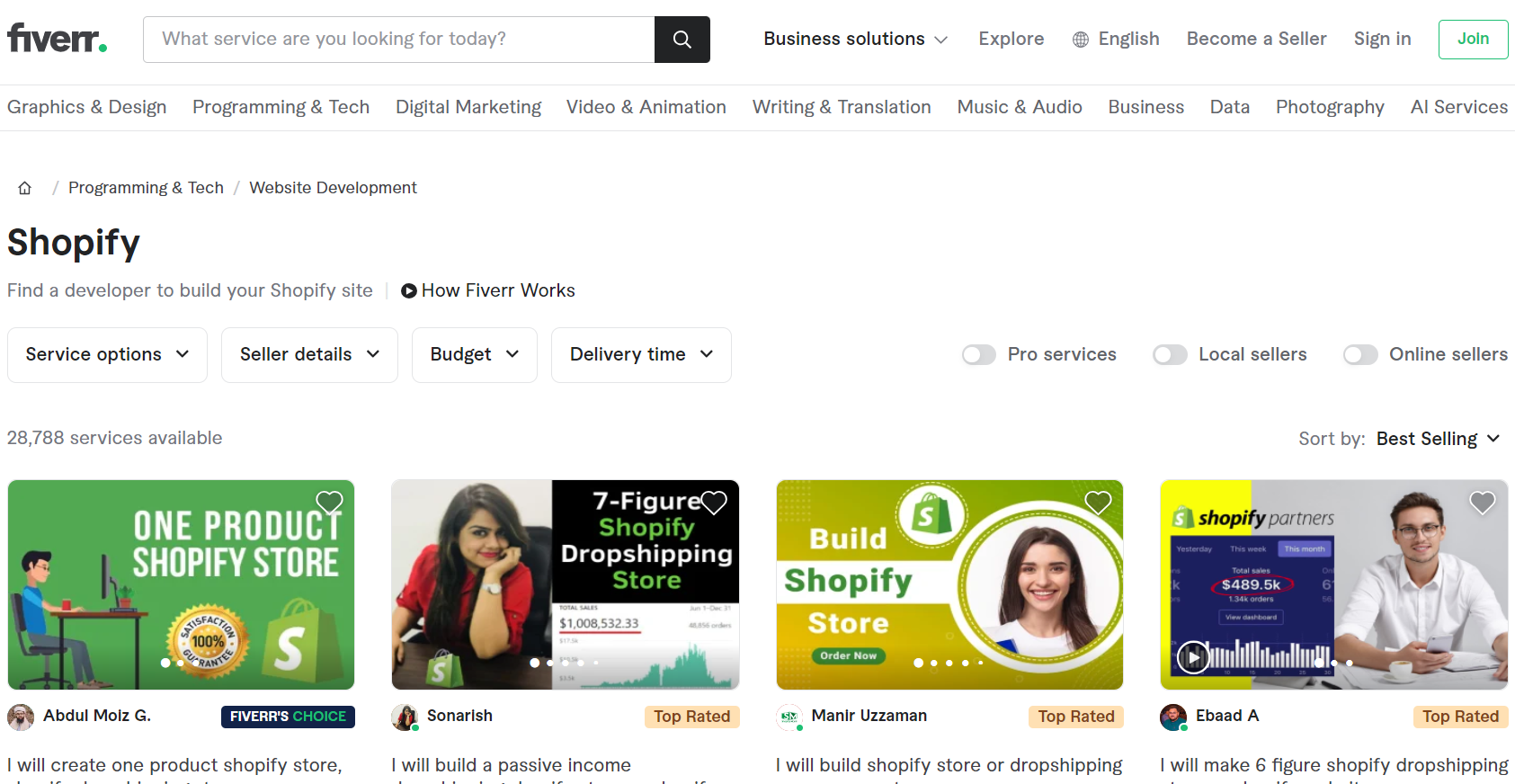 在Fiverr上,网站开发中的Shopify开发是一项热门服务。自由职业者和Shopify专家提供广泛的Shopify开发服务,包括构建和定制网站、帮助商家设置和集成商店等。