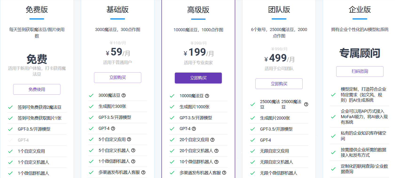 魔法AI设置了多档定价,分为免费版、高级版、团队版、企业版。
