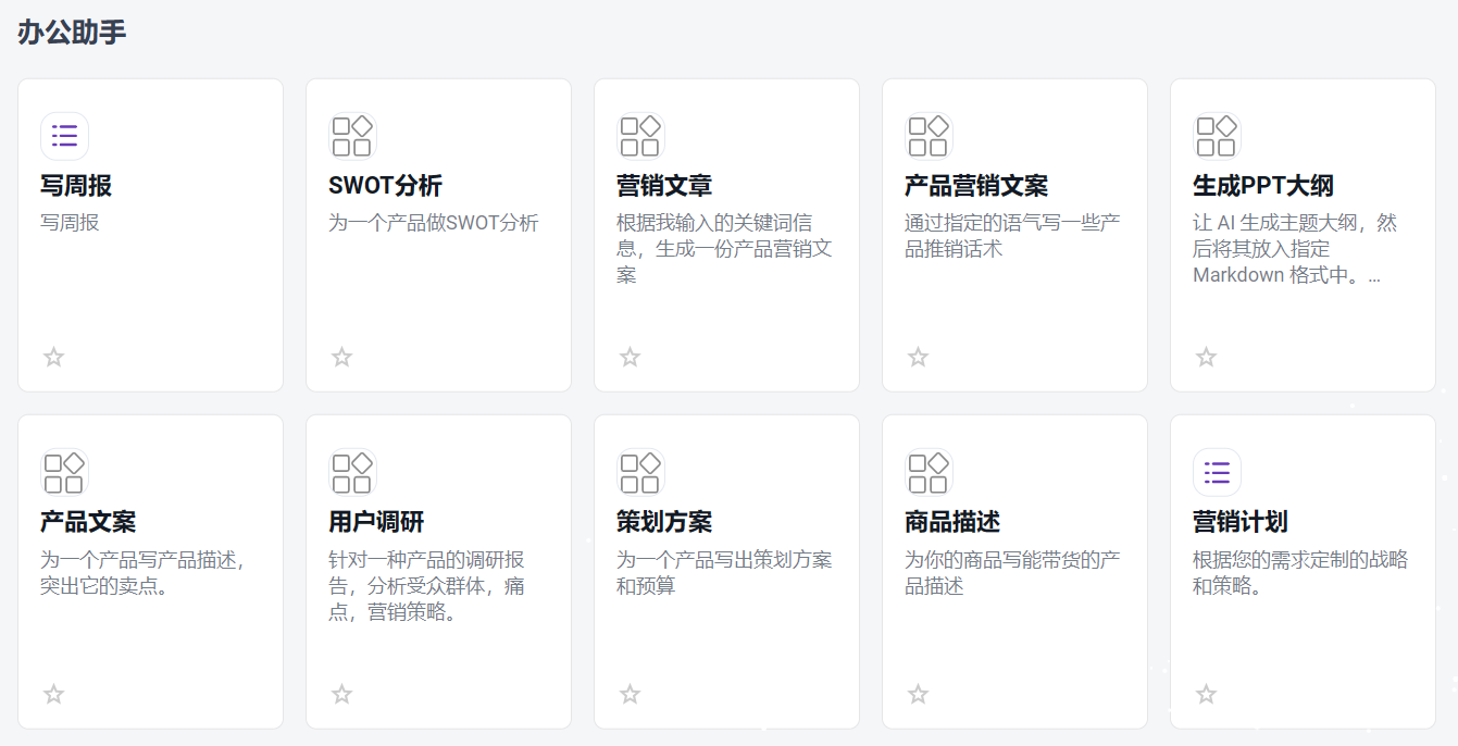 帮助办公室工作人员更轻松完成文案,包括生成PPT大纲,每周周报等。