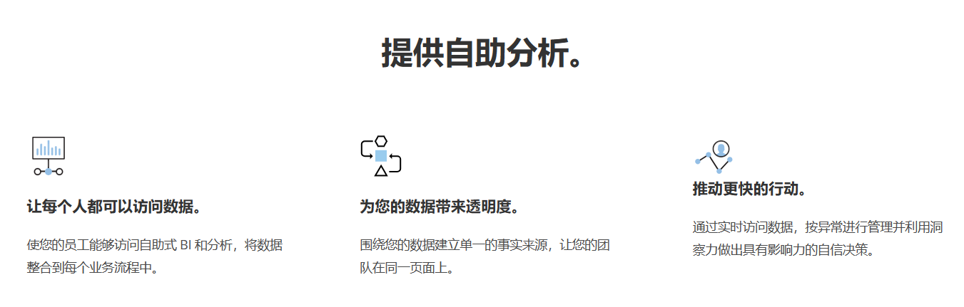 让人们可以访问自助式BI和分析以做出自信的决策,同时维护数据治理,在保持安全性和治理的同时扩大数据的利用率。