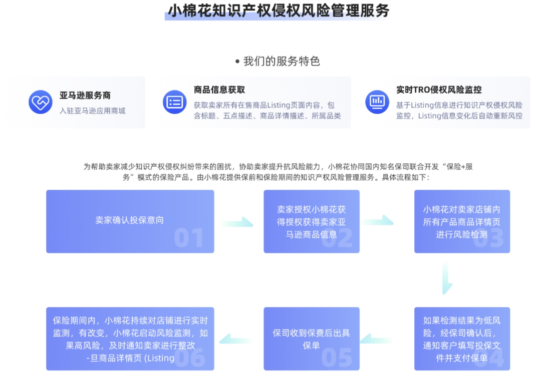 针对跨境电商经营中的各类风险痛点,小棉花联合多家海内外知名保险公司,首创跨境电商知识产权TRO保险,并已陆续上线卖家商业责任险、退货险、邮包险、等多款保险产品,累计为全球数万跨境卖家提供综合性保险解决方案和提供履约服务。