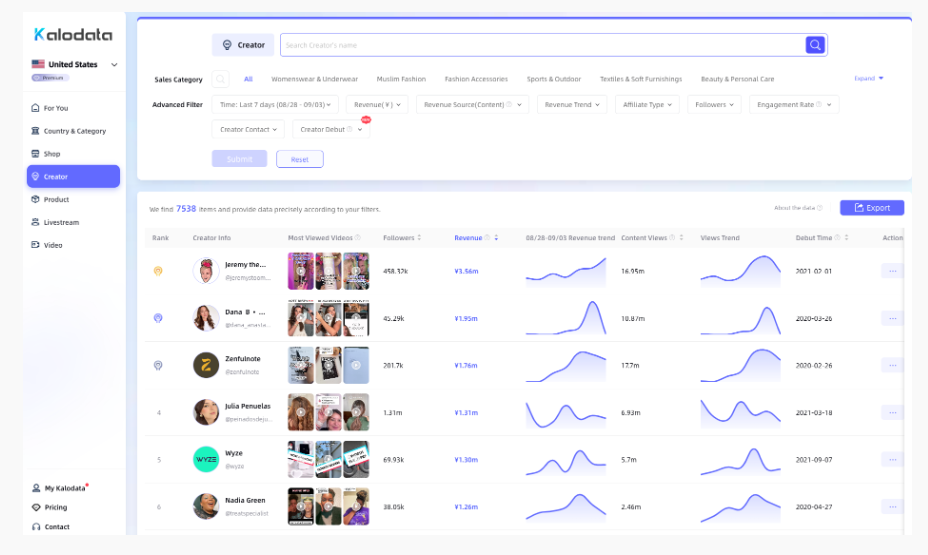 受众人口数据统计:Kalodata 提供有关 TikTok 受众人口统计数据的见解,帮助您更好地了解观众并创建与他们产生共鸣的内容。