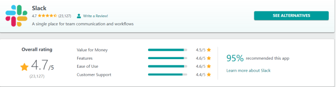 大数跨境团队查阅了一些世界上最知名的评价/评分平台,Slack获得了用户的普遍好评。比如,在相关测评网站中,Slack总评分为4.7/5.0分,共23124人评论