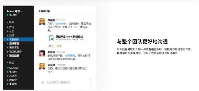 Slack提供了简洁的用户界面和新颖的聊天室交互方式,用户可以轻松熟悉并使用它。此外,Slack提供异步沟通模式,使用户可以随时发送消息。