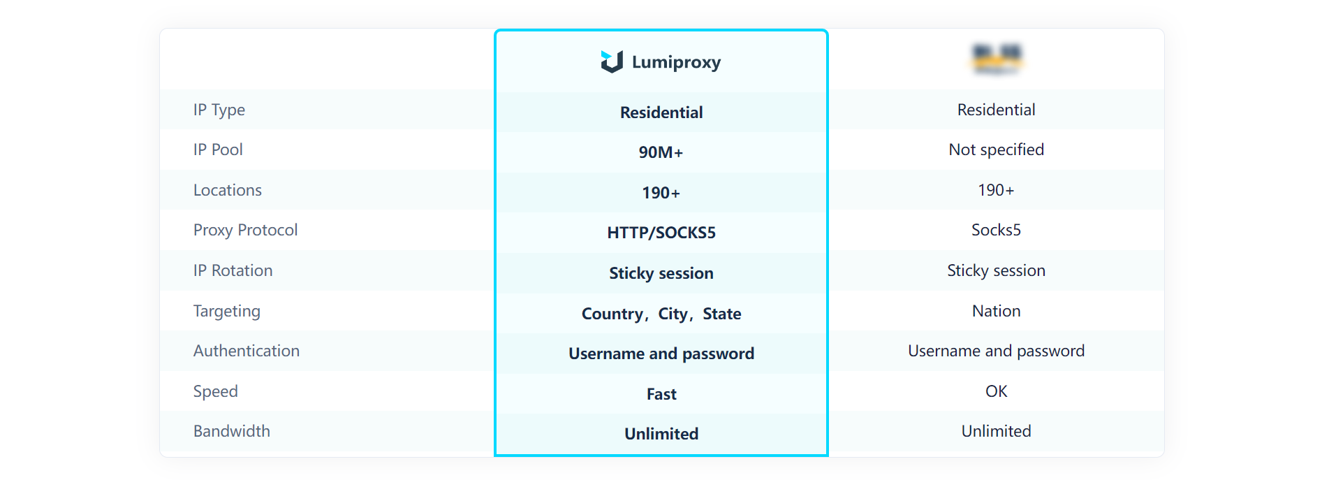 Lumiproxy 在提供住宅 IP、地理定位的精确性、多种代理协议的支持、IP 轮换和认证方式的安全性等方面显示出更多的优势,为用户提供更高水平的匿名性和可靠性。