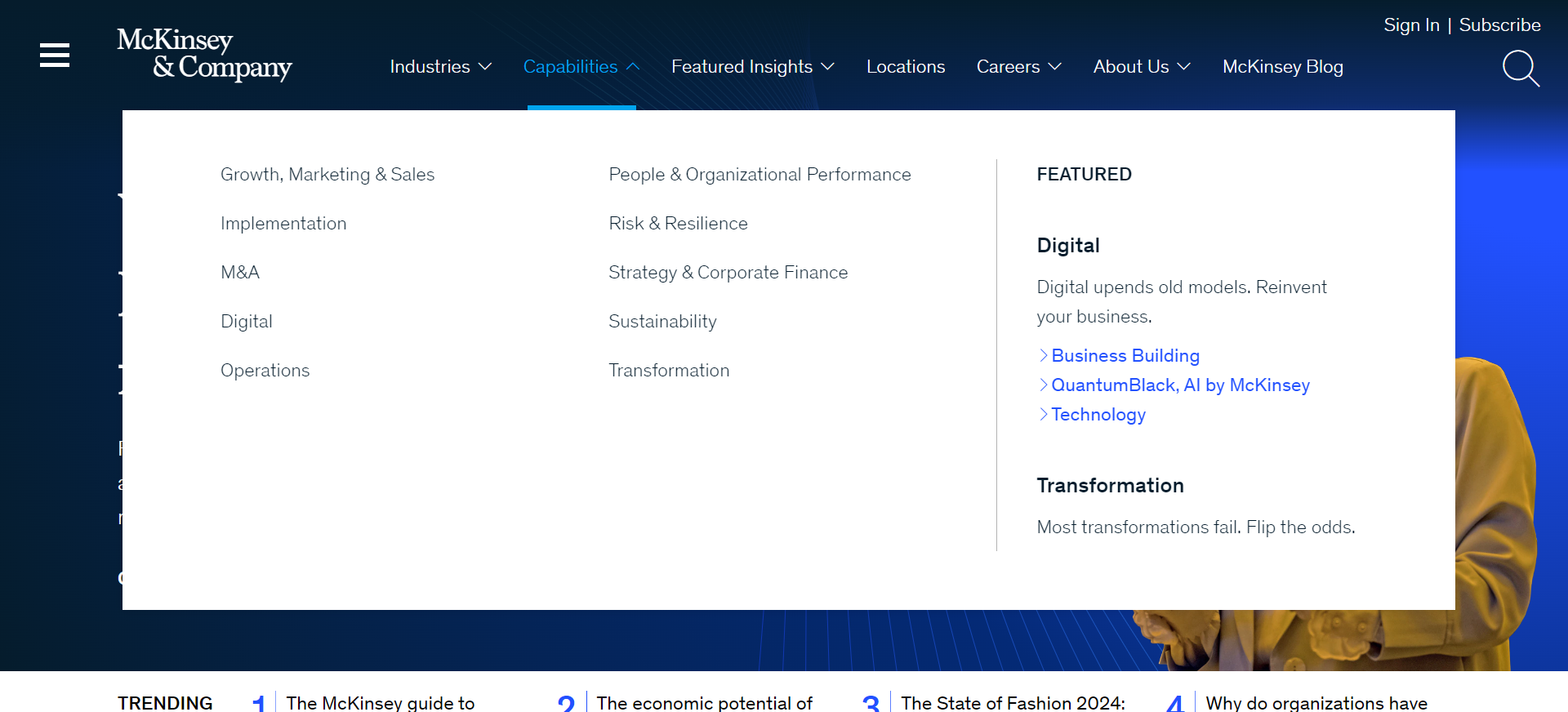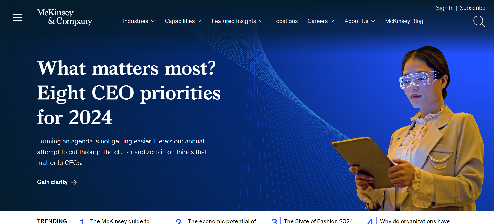 麦肯锡提供全方位的战略和管理咨询服务,涵盖企业的各个层面,包括战略制定、业务重组、经营运作和组织结构等。公司以解决高级管理层关心的议题为重点,致力于帮助客户实现可量化的业绩改进。