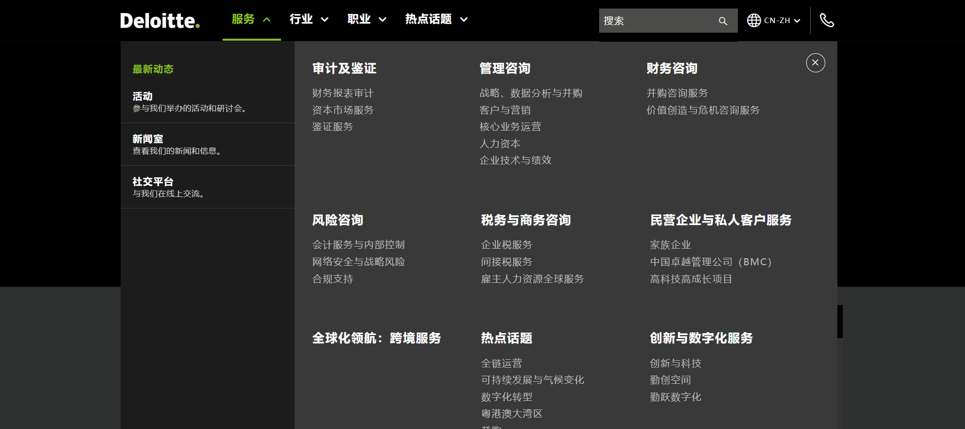 德勤提供涵盖审计、咨询、财务、风险管理、税务和法律等多个领域的一站式专业服务。这些服务涵盖了各种企业需求,为客户提供综合性解决方案。
