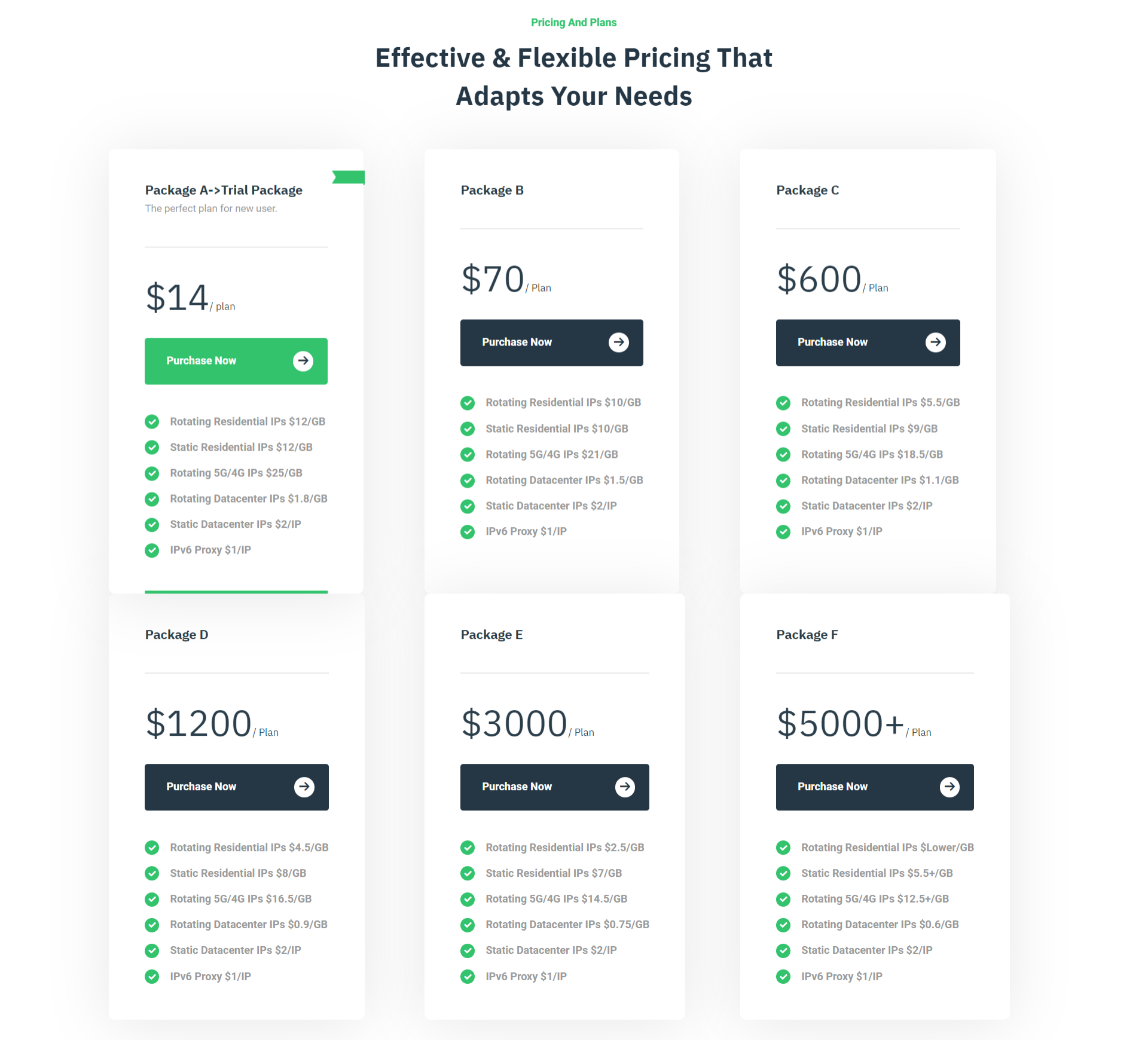ROLA-IP 提供多样灵活的套餐,从适合新用户的 14 美元试用套餐开始。价格结构根据需求灵活变化,不同套餐的选项包括旋转住宅 IP 和静态住宅 IP 的每 GB 12 美元,旋转 5G/4G IP 每 GB 25 美元,旋转数据中心 IP 每 GB 1.8 美元,静态数据中心 IP 每个 2 美元,IPv6 代理每个 1 美元。随着套餐规模的增加,价格更具成本效益性,高级套餐如 F 套餐提供具有竞争力的价格,确保了旋转、静态、住宅、5G/4G 和数据中心 IP 以及 IPv6 代理的可负担性和适应性。