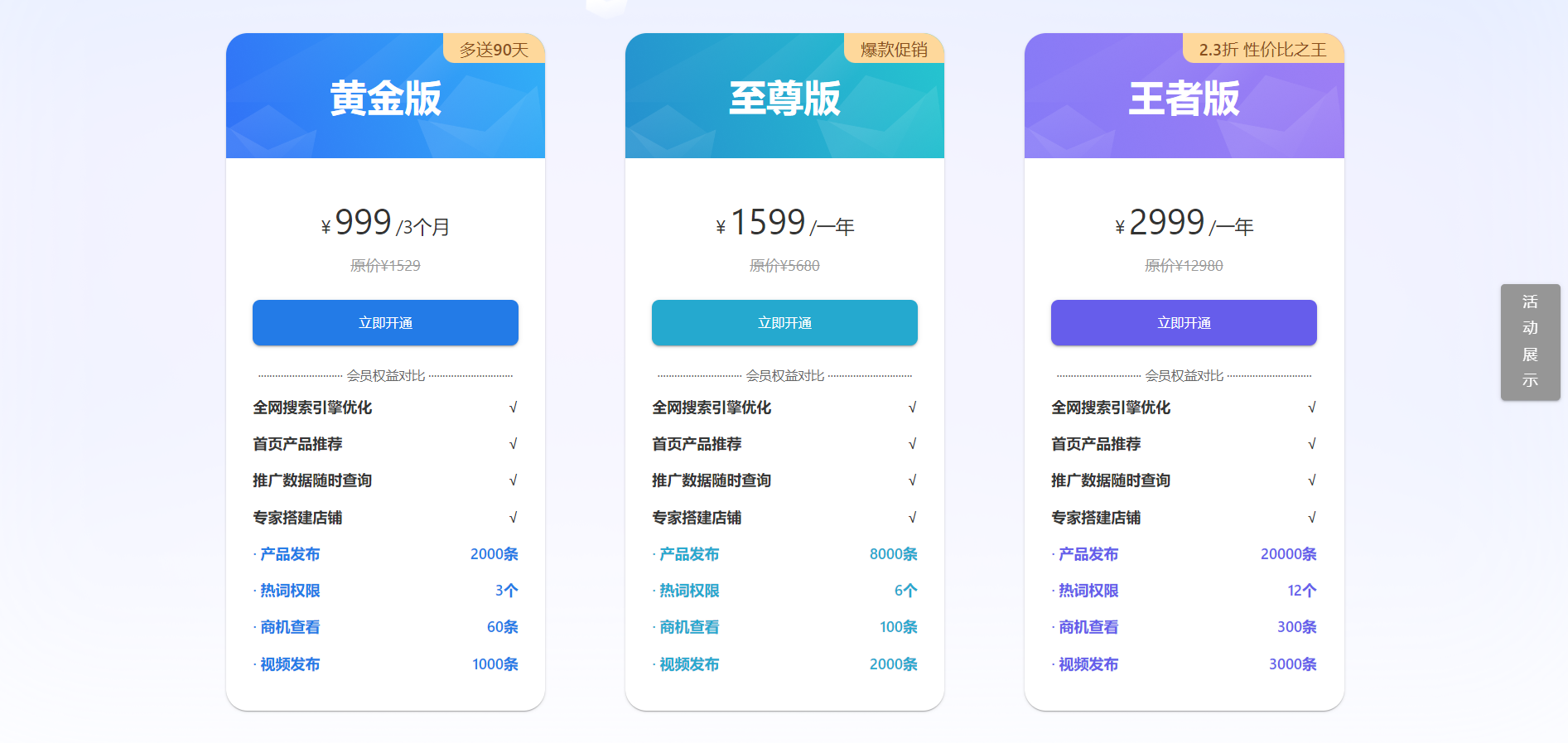 马可波罗网提供了多种会员套餐,分别为黄金版、至尊版和王者版,旨在满足不同用户的需求,为企业提供更广泛的推广和服务。黄金版套餐包括全网搜索引擎优化、首页产品推荐、推广数据随时查询、专家搭建店铺等基础权益,同时提供产品发布、热词权限、商机查看和视频发布等服务。至尊版套餐在基础权益的基础上,拥有更多的产品发布、热词权限、商机查看和视频发布等高级服务。而王者版套餐更是提供了全方位的高级权益,包括大量的产品发布、热词权限、商机查看和视频发布,为用户提供更大的推广空间和曝光机会。这些丰富的会员权益,使用户能够根据企业需求选择适合的套餐,全面提升企业在B2B市场的曝光和竞争力。