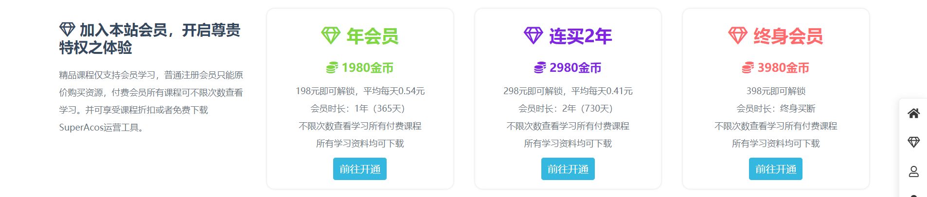 SuperAcos 提供多种会员套餐,让用户根据个人需求和预算选择最适合的学习计划。年会员套餐仅需 198 元,相当于每天仅需 0.54 元,即可解锁一年(365 天)的会员时长,无限次数查看学习所有付费课程,并享有所有学习资料的下载权限。对于更长期的学习计划,用户可以选择连买 2 年套餐,仅需 298 元,平均每天 0.41 元,获得两年(730 天)的会员时长,同样享有无限次数查看和下载的权益。对于追求终身学习的用户,SuperAcos 提供终身会员套餐,3980 金币即可解锁,永久买断会员时长,享受不限次数查看和下载的权益,为用户提供更灵活和长期的学习支持。