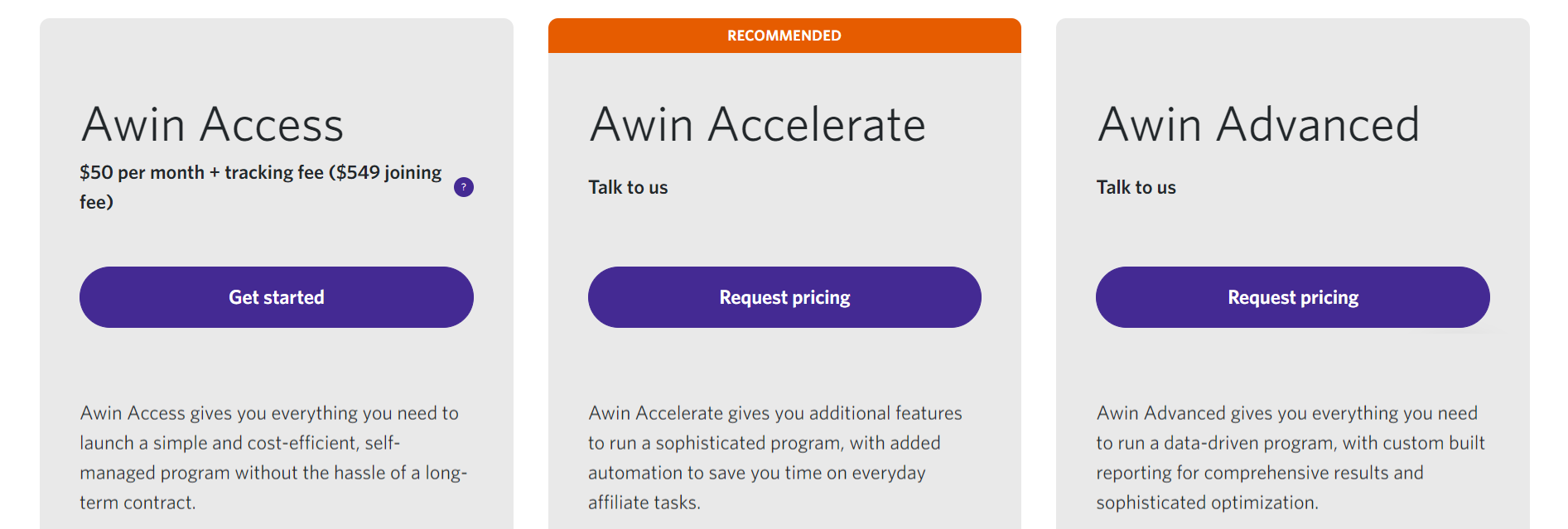 Awin 提供多种灵活的定价计划,适用于不同规模和需求的在线业务,帮助其通过联盟营销找到合作伙伴。Awin Access 计划每月 50 美元,加入费用为 549 美元,提供简便高效的自主管理方案,用户可选择按交易价值百分比支付佣金给联盟合作伙伴,并支付额外的 2.5% 交易价值的 Awin 跟踪费用。Awin Accelerate 和 Awin Advanced 计划则提供更高级的功能和自动化,用户可根据业务需求与 Awin 洽谈定价。通过 Awin 的不同计划,用户可根据业务需求选择最合适的定价模式,体验灵活、智能的联盟营销解决方案。