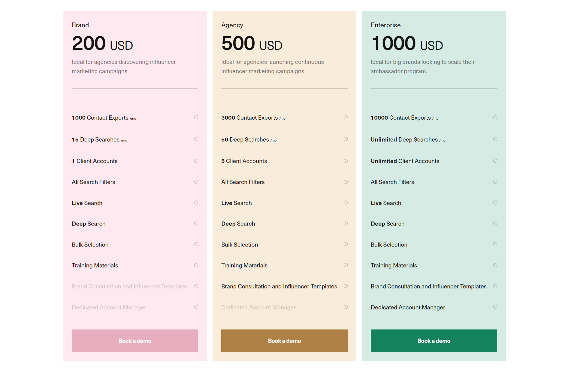 inBeat 提供多个灵活的定价方案,以满足不同用户的需求。对于正在进行影响者营销活动的机构,Brand 方案每月收费 200 美元,提供 1000 次联系导出和 15 次深度搜索等功能。对于推出连续影响者营销活动的机构,Agency 方案每月收费 500 美元,包含 3000 次联系导出和 50 次深度搜索。而对于希望扩大品牌大使计划规模的大型品牌,Enterprise 方案每月收费 1000 美元,提供 10000 次联系导出和无限次深度搜索。此外,inBeat 还提供了完全托管的微影响者解决方案,用户可以与 30,000 多名审核过的创作者合作,并获得专属的活动策略师支持。
