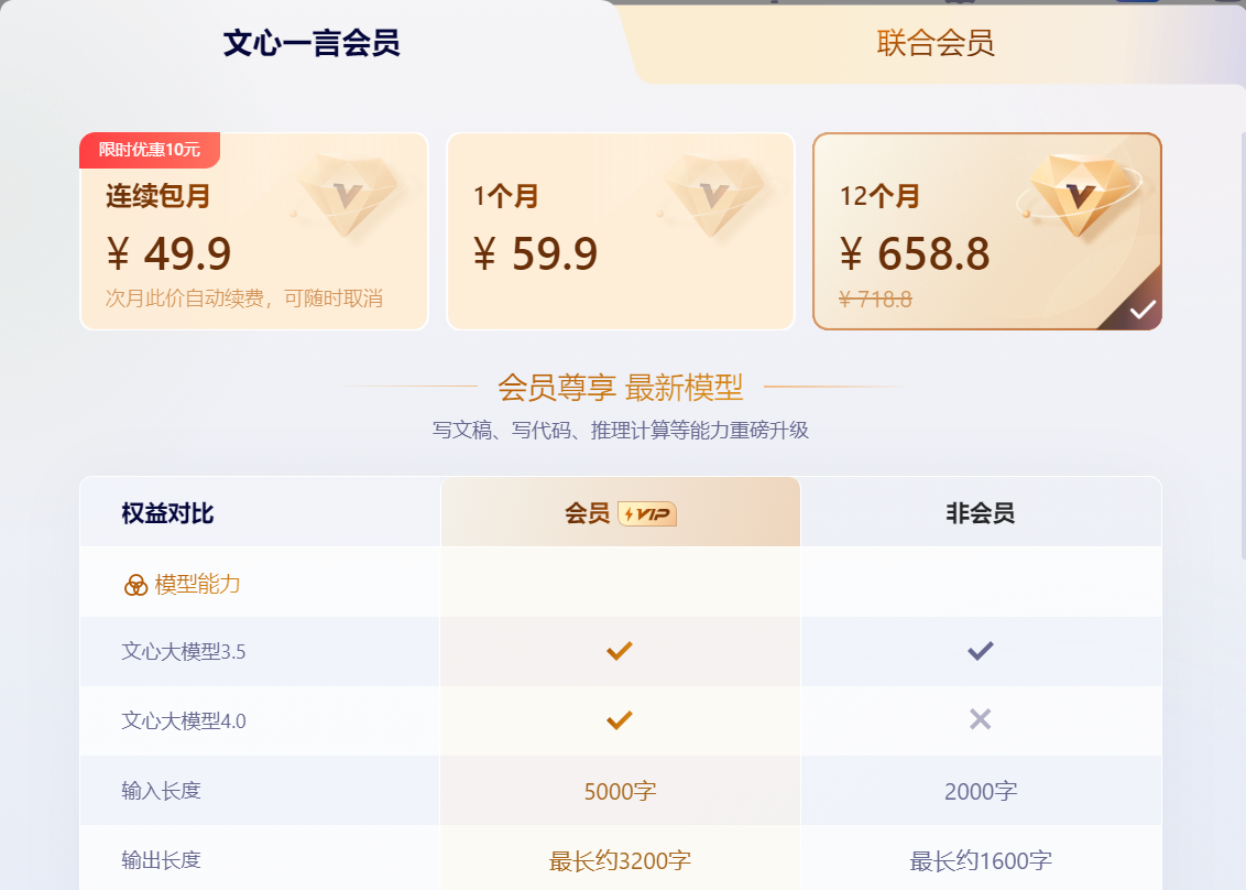 文心一言提供了多种会员订阅选项,让用户可以根据其需求和预算选择合适的方案。用户可以选择 ¥49.9 的连续包月方案,享受会员特权,包括文心大模型 4.0 的升级能力,输入长度达 5000 字,输出长度最长约 3200 字等。此方案自动续费,但用户可随时取消。单月订阅费用为 ¥59.9,而 12 个月的订阅费用为 ¥658.8,优惠套餐总计为 ¥718.8。会员尊享最新模型,涵盖写文稿、写代码、推理计算等多方面的升级能力。会员权益还包括指令润色、图片生成提升、插件权益等多项特权,使用户体验更为丰富。与此同时,文心一格白银会员权益也包括极速生成多尺寸高清图像、创作海报和艺术字,同时提供 AI 编辑改图修图服务,联合会员则可以选择综合享受文心一言和文心一格的多重权益,为用户提供更全面的使用体验。