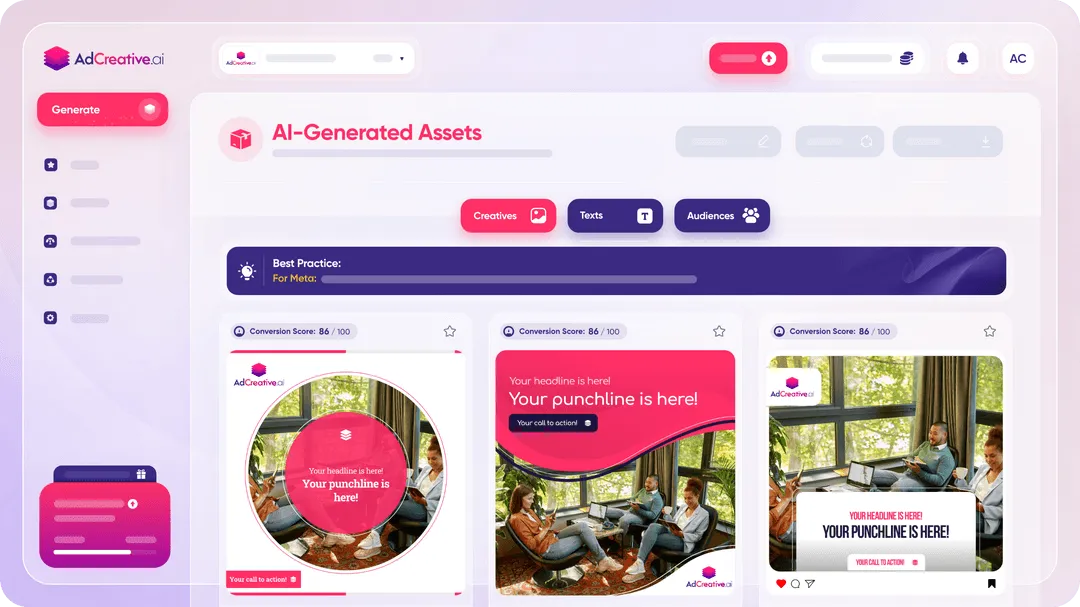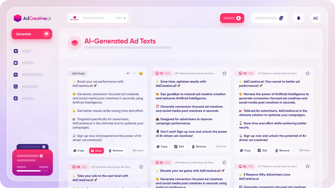 AdCreative.ai 利用人工智能作为撰稿人,使用户能够生成针对特定广告平台的以销售为重点的文本和标题。这一功能简化了内容创作,使用户能够专注于核心业务活动,同时确保引人入胜且适合平台的消息。